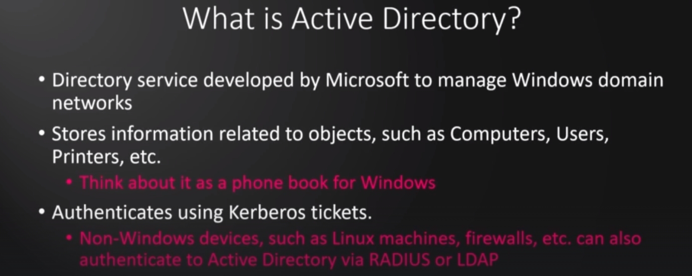 Active directory is just like a phone book, Basically used to store series of information in relation to what is called an object , could be printers, computers, users etc