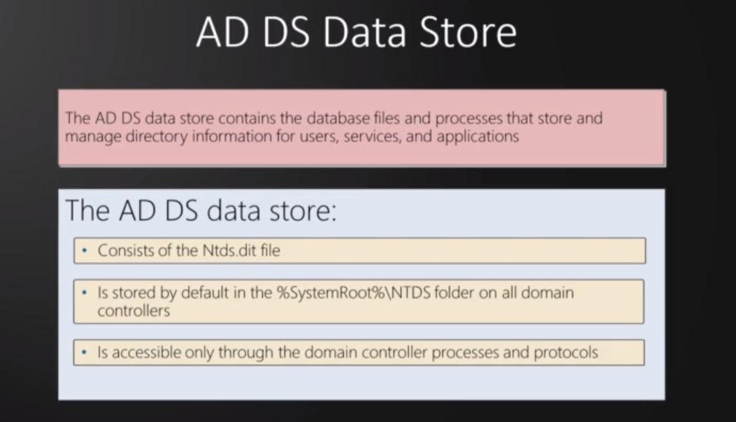 AD DS Data Store : Contain database files for users, services and applications also stores information about user accounts, such as names, passwords, phone numbers, and so on, and enables other authorized users on the same network to access this information. it also stores a very important file called Ntds.dit
