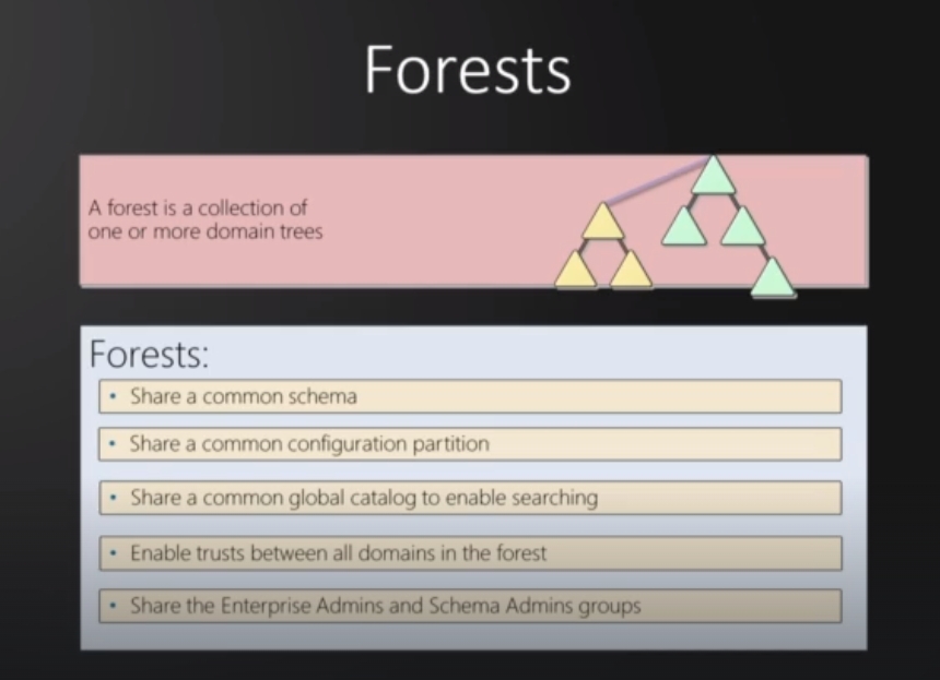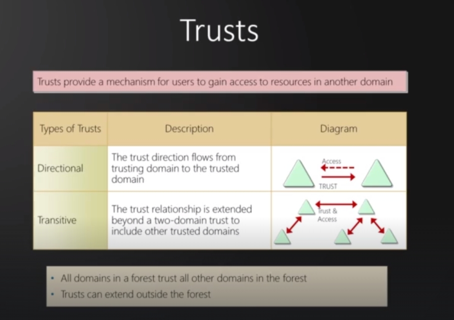 Trusts : Is a method of connecting two distinct Active Directory domains (or forests) to allow users in one domain to authenticate against resources in the other.