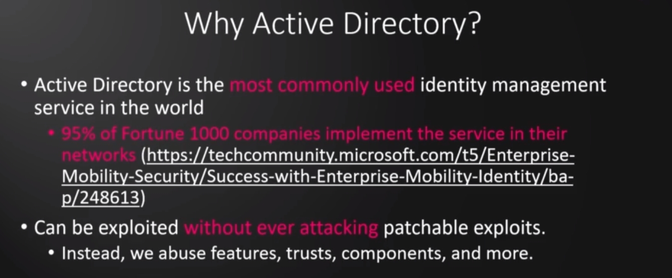 Active directory is commonly used in banks and 95% of fortune 1000 companies and the major reason why it is vulnerable in the wild are due to misconfigurations, bad setup etc