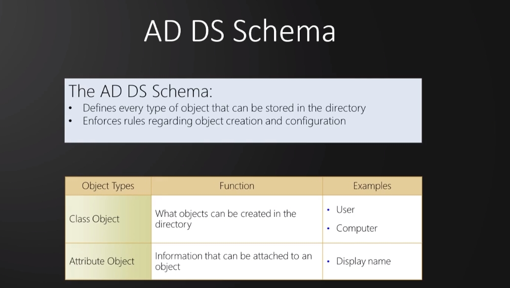 AD DS Schema : You can think of it as a rule book or a blue print, which defines every type of object that can be stored within our directory (Objects are normally defined as either resources, such as printers or computers, or security principals, such as users or groups.)