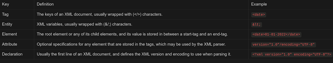 The above example shows some of the key elements of an XML document, like: